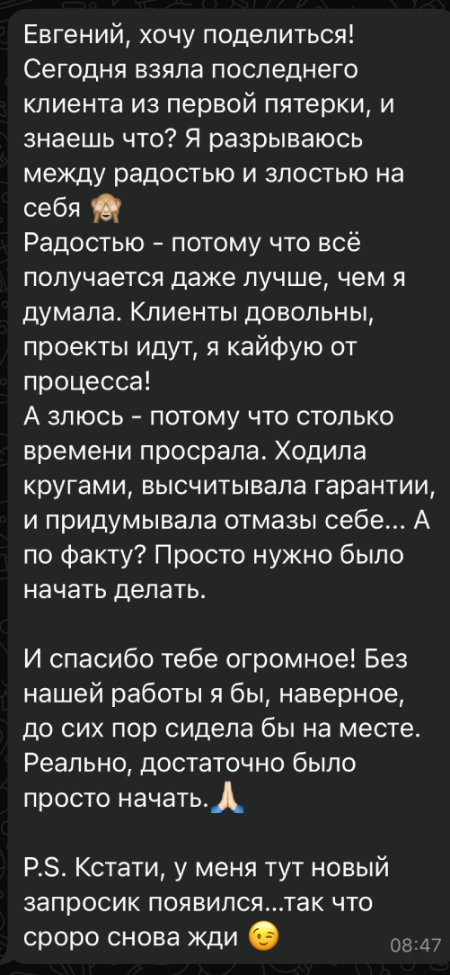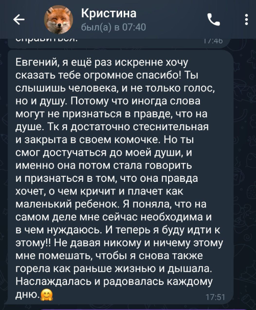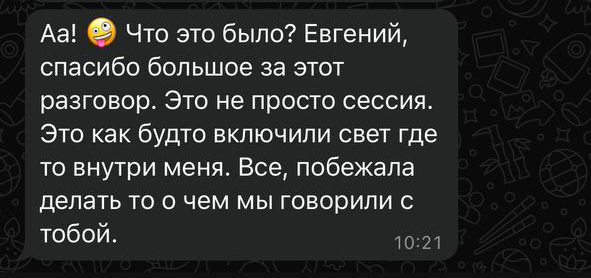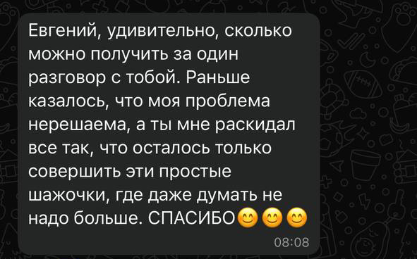 Все что потребовалось — это несколько встреч, где мы применили мою авторскую систему диагностики внутреннего состояния и работы с жизненными приоритетами.