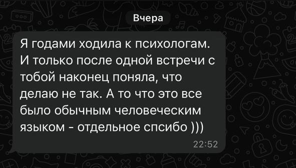 Не скажу, что это всегда приятно — иногда правда о себе может оказаться неожиданной или даже болезненной. Но это В ТЫСЯЧИ РАЗ ЭФФЕКТИВНЕЕ, чем месяцы хождения по кругу в надежде, что когда-нибудь все само собой прояснится.