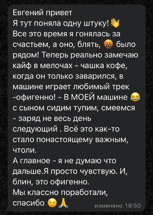 И когда вы быстро получаете не только понимание, но и энергию для реальных изменений. Появляется совершенно другое качество жизни.